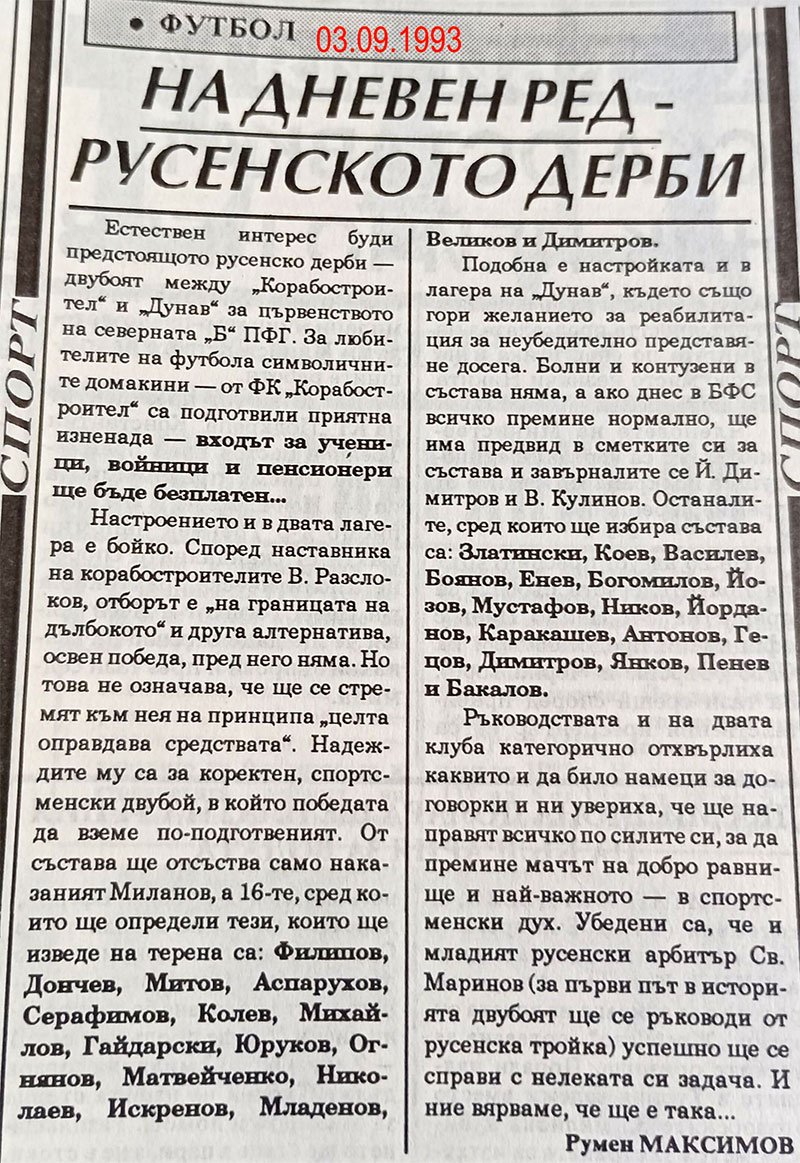 На дневен ред – русенското дерби 3 септември 1993 ЛокоПрес 1993 0 Сподели: Share on Facebook (Opens in new window) Facebook Share on X (Opens in new window) X Share on WhatsApp (Opens in new window) WhatsApp Share on Telegram (Opens in new window) Telegram Email a link to a friend (Opens in new window) Email Print (Opens in new window) Print ЛокомотивРусенско дерби