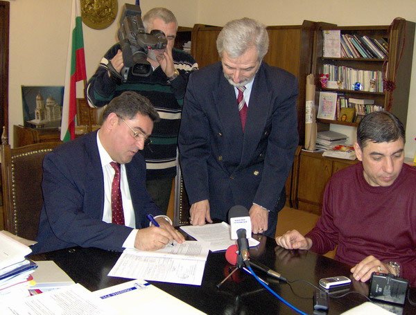Кметът на Русе Божидар Йотов /вляво/ подписва концесионния договор за стадион „Локомотив“ през 2006 г.