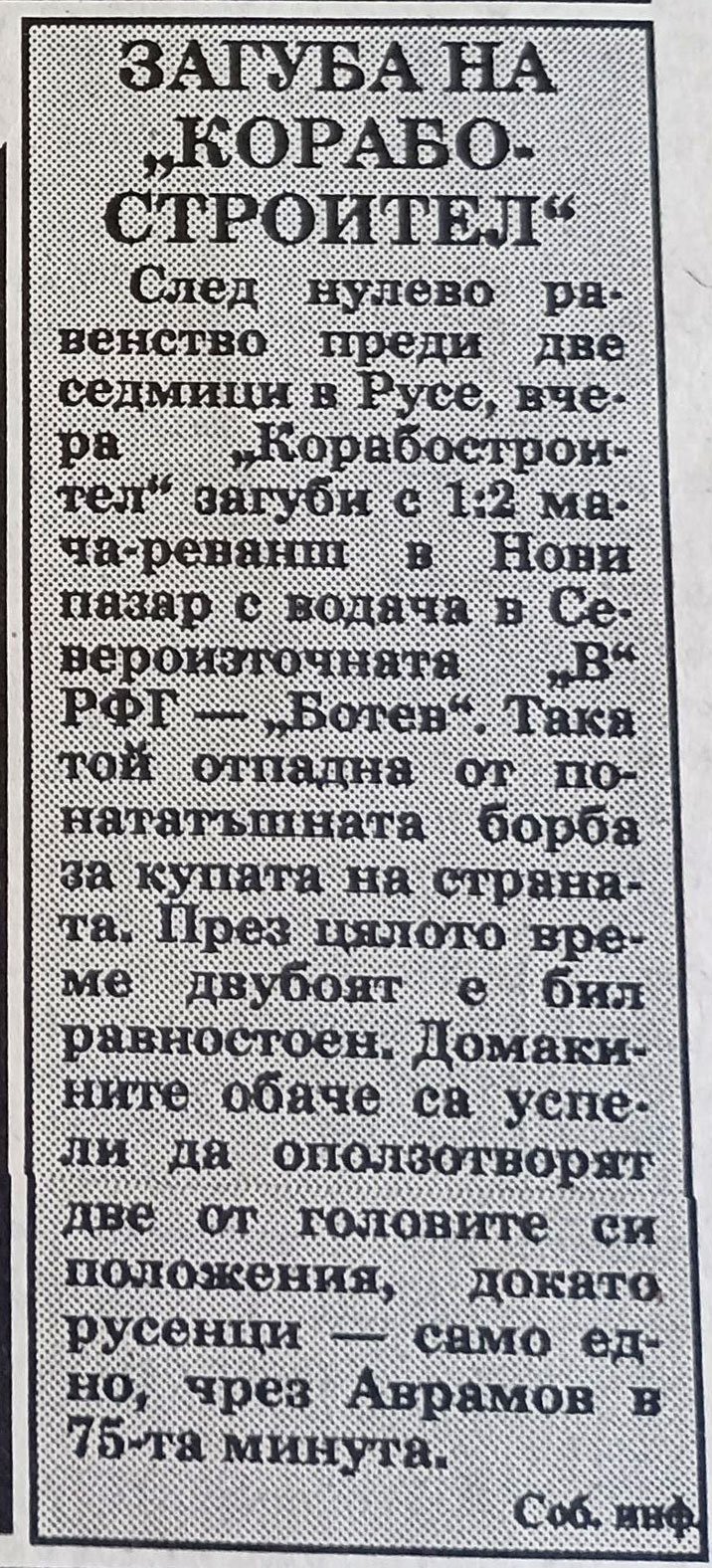 Ботев (Нови пазар) – Корабостроител (Русе) 21 октомври 1992 ЛокоПрес 0 21 октомври 1992 2 - 1 . Инфо30 Подробности Дата Начало Първенство/Турнир Сезон Кръг 21 октомври 1992 14:30 Купа на България 1992/93 IV кръг Стадион Градски стадион, Нови пазар ul. \"Doktor Petar Beron\" 39, 9900 Novi pazar, Bulgaria Локомотив (Русе) Красимир Гецов защитник Костадин Аврамов нападател 75' старши треньор: Тодор Тодоров Сподели: Share on Facebook (Opens in new window) Facebook Share on X (Opens in new window) X Share on WhatsApp (Opens in new window) WhatsApp Share on Telegram (Opens in new window) Telegram Email a link to a friend (Opens in new window) Email Print (Opens in new window) Print