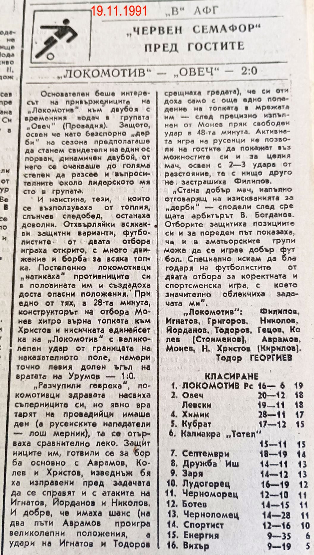 Локомотив (Русе) – Овеч (Провадия) 16 ноември 1991 ЛокоПрес 0 16 ноември 1991 2 - 0 . Инфо Подробности Дата Начало Първенство/Турнир Сезон Кръг 16 ноември 1991 14:30 Североизточна "В" група 1991/92 XIII кръг Стадион стадион „Локомотив“, Русе Ela 71, 7004 g.k. Tsevtitsa, Ruse, Bulgaria Локомотив (Русе) 1Тома Филипов вратар2Евгени Игнатов нападател3Драгомир Григоров защитник4Ивайло Николов защитник5Искрен Йорданов защитник6Мариян Тодоров полузащитник7Красимир Гецов защитник8Евгени Колев полузащитник9Костадин Аврамов нападател10Румен Монев полузащитник 48'11Никола Христов полузащитник 28'Петко Кирилов 11 защитникСтефан Стоименов 8 защитник старши треньор: Тодор Тодоров Съдии и делегат Главен съдия Веселин Богданов (Велико Търново) Сподели: Share on Facebook (Opens in new window) Facebook Share on X (Opens in new window) X Share on WhatsApp (Opens in new window) WhatsApp Share on Telegram (Opens in new window) Telegram Email a link to a friend (Opens in new window) Email Print (Opens in new window) Print